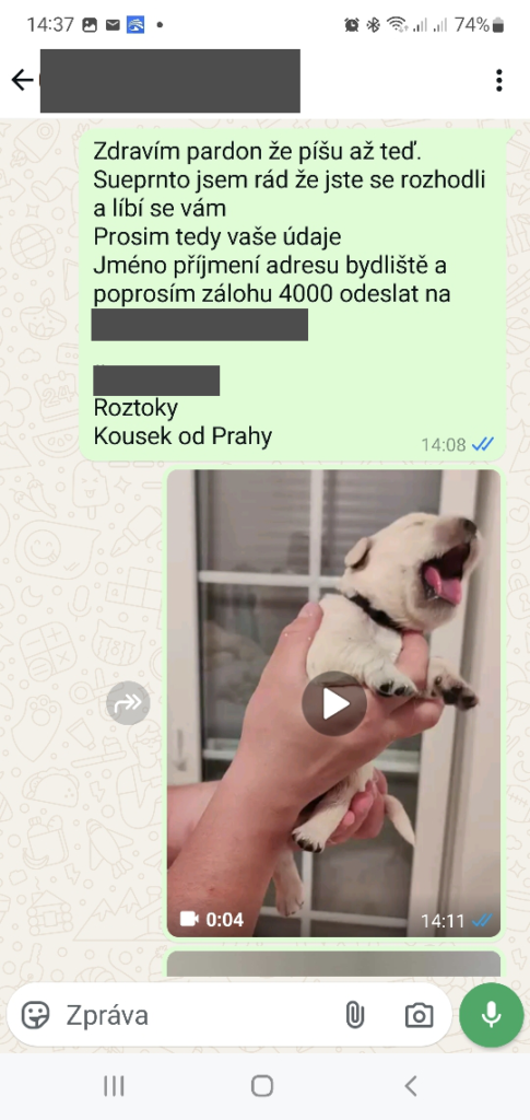 Hledali jsme pejska, štěně konkrétní rasy. Nalezené inzeráty v omezeném počtu k okamžitému odběru. Komunikace s majitelem byla bezchybná. Vyzvednutí cca za 14 dnů až bude moc být pejsek odstaven od fenky, sice takzvaný bez papírák, ale z dobrého chovu atd. I fotografie a video jsme dostali na WhatsApp. Zájemců ale bylo více a pokud to myslíme vážně, je nutná záloha. Pán z druhého konce republiky, takže reakce nutná okamžitě. Kdo by odolal když ho děti probodávají očima a rozplývají se nad videem batolícího se pejska…